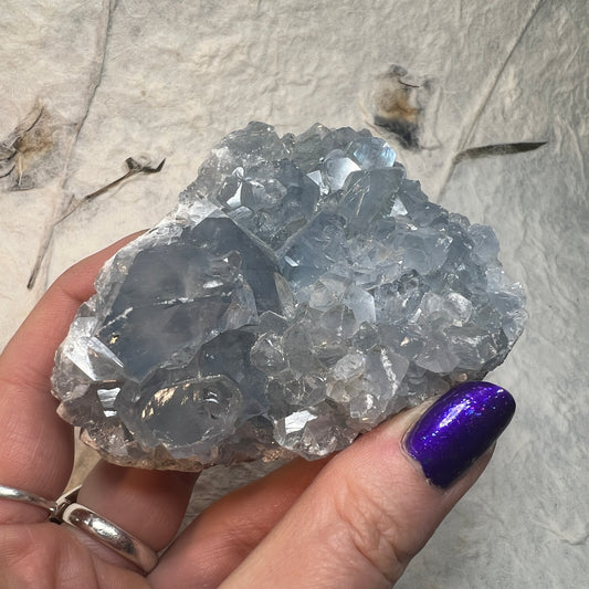 Celestite, also known as Celestine, is a mineral that forms blue crystals. Celestite is often associated with divine power and is thought to increase understanding, higher consciousness, as well as mindfulness when used in meditation and prayer